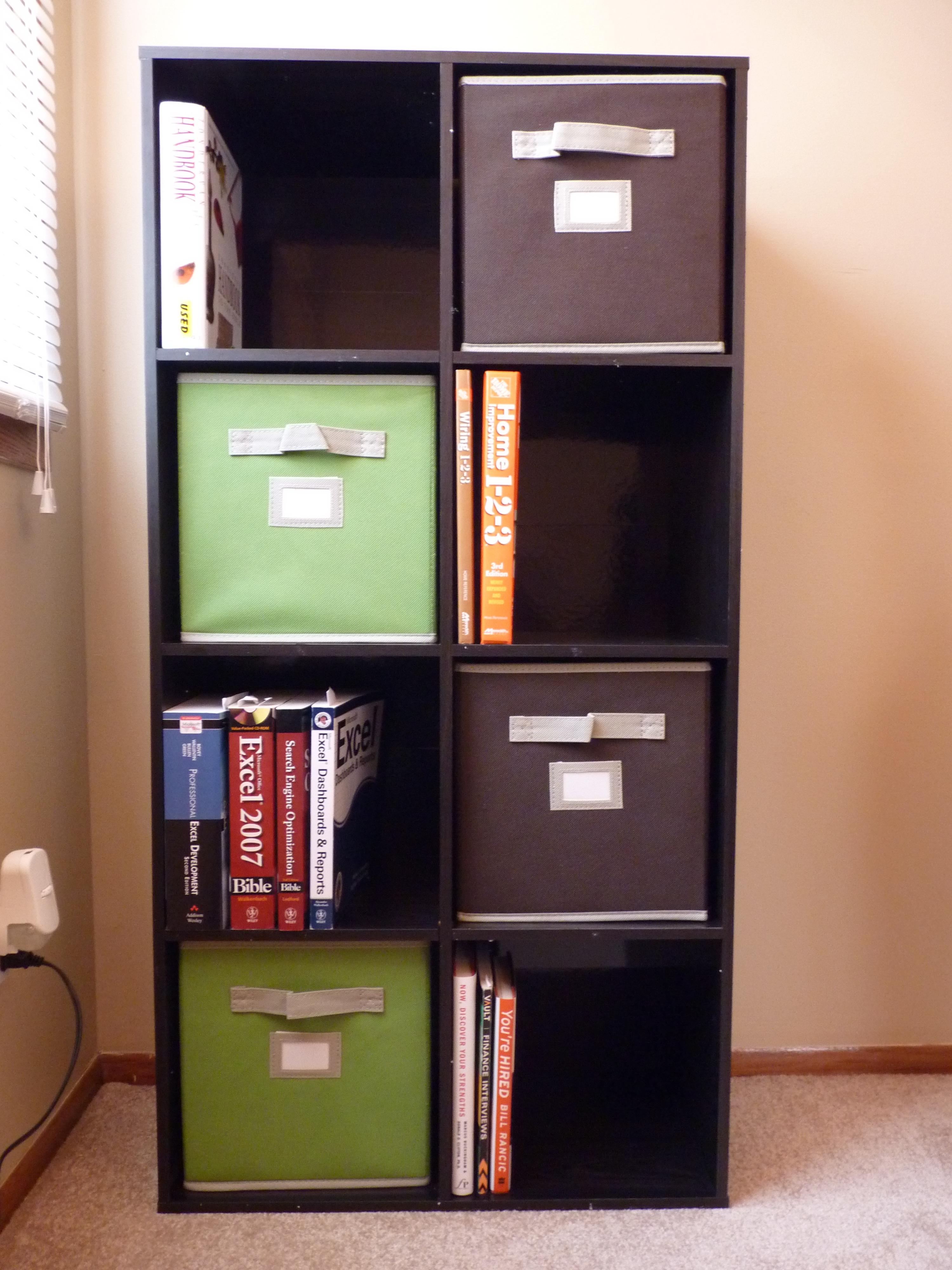 First we grabbed two of these Martha Stewart Living 8-Cube Organizers (4 fabric bins were included). Total cost was just under $60 for both of them. Here is the first one all set up in our office: