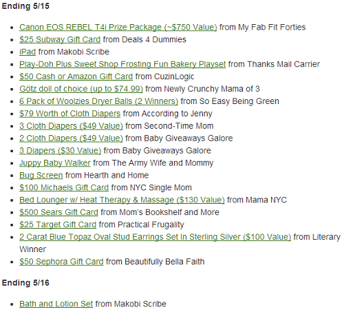 You may be skeptical as to whether giveaways are worth your time, or how this could be a “productive” use of your time. In reality, winning these prizes can make you money over time. I haven’t written a post about it yet, but we have won quite a few giveaways and sell some of the winning items for money. They also provide great gifts (think baby products for friends that are having baby showers). There are some fairly big giveaways, such as $500 cash, $1,000 televisions, $700 kitchen ranges, etc. that will definitely make it worth your while if you end up winning. On this blog alone we’ve co-hosted giveaways that have totaled approximately $4,000 in prizes (and that was made up of only 5 giveaways).