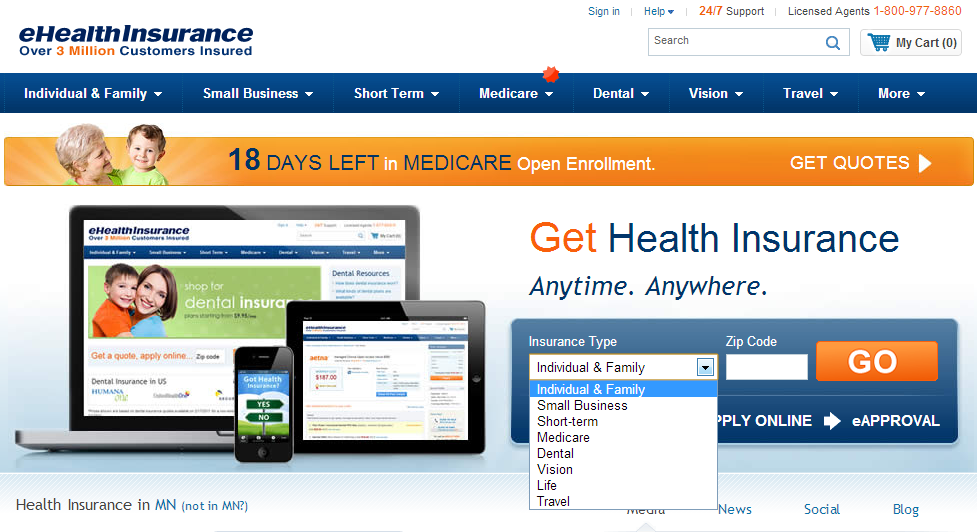 To view the plans available to you, first head on over to eHealthInsurance.com. Once you are there, choose the type of insurance you are looking for.