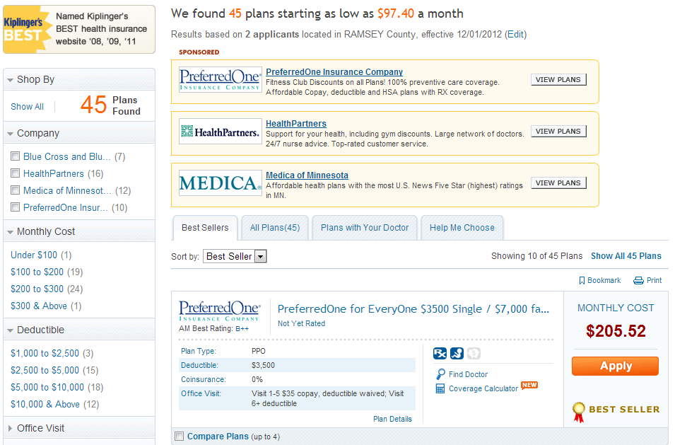 Click GO to view deals. There will be offers from various health insurers with various rates. Before you think the rates listed are too high, realize that this is to prevent something catastrophic that will leave you with hospital bills in the tens of thousands of dollars. Also realize that when health insurance exchanges open on January 1st, 2014, there should be more competitive rates available to those who are not offered health insurance through their employer. Until then, you will have to purchase through the private market if you want coverage, and eHealthInsurance is the best marketplace out there right now.